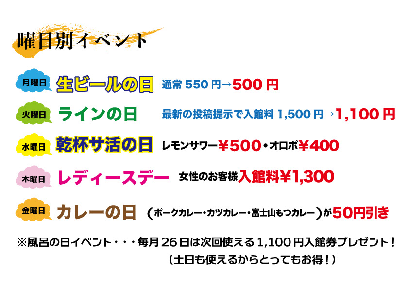 8月イベント掲載いたしました。富士登山帰りアウトレット帰りなどリフレッシュにお越しください。